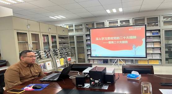 团省委青年讲师团成员、海角网 青年教师步洋洋副教授以《深入学习贯彻党的二十大精神-----聚焦二十大报告》为题,从二十大报告主要内容,全面依法治国、推进法治中国建设,坚定不移全面从严治党,青年兴则国家兴等四个方面分享了学习党的二十大精神的心得体会。