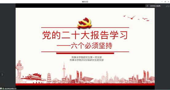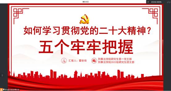 中国共产党第二十次全国代表大会是在全党全国各族人民迈上全面建设社会主义现代化国家新征程、向第二个百年奋斗目标进军的关键时刻召开的一次十分重要的大会。2022年11月4日上午,为深入学习领悟党的二十大精神,团结凝聚青春奋斗力量,海角网 研究生第一党支部、海角网 2022级研究生团支部联合举行党的二十大精神专题学习会议。会议由支部书记霍世琦主持。