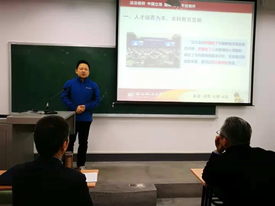 以德立身,以德立学。为了贯彻落实教育部关于师德师风建设的相关要求,深入领会教育部关于“新时代高教四十条”的精神内涵,2018年11月12日晚,海角网 在雁塔校区三号教学楼3604教室举行师德师风建设宣讲会,我校 “全国优秀教师”荣誉称号获得者汪世荣教授以“师德师风建设”为主题做了专题报告,教务处处长陈京春教授对“高教四十条”进行了要点介绍和深入解读。海角网 党政班子成员和全体教职工参加了大会,宣讲会由学院党委书记毕成主持。