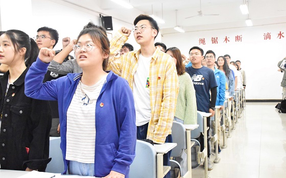 接着,由优秀团员标兵2016级姜鑫宇同学领誓,带领新团员进行庄严的入团宣誓、所有老团员再次重温入团誓词。铿锵有力的誓言表达出了新时代青年不忘跟党初心、牢记青春使命的决心。
