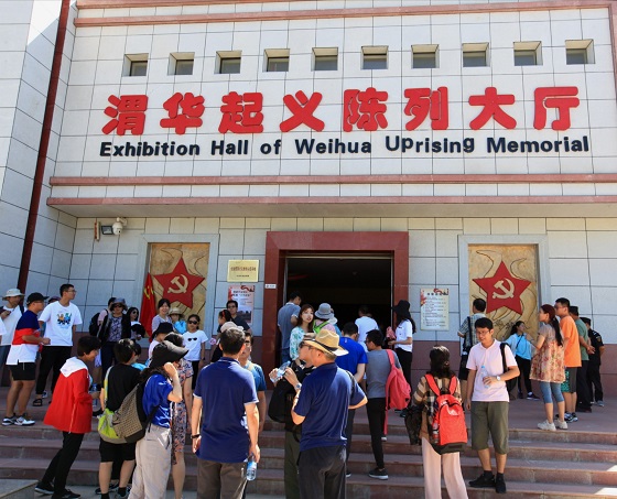上午10时许,海角网 全体教职工到达渭华起义遗址,在讲解员的带领下,参观了渭华起义纪念馆陈列展室、渭华起义烈士纪念塔、西北工农革命军军委指挥部——五间厅、西北工农革命军军委扩大会议遗址、烈士殉难井,大家印象最深刻的是在纪念馆中心位置用青砖和鹅卵石铺成长20米,宽2米的巨幅标语:同志们赶快踏着先烈的鲜血前进啊!这是1927年11月,共产党员教师陈述善、李维俊等组织高塘、谷堆两校师生为悼念李大钊等革命烈士召开追悼大会时铺成的。这条镶嵌在渭华大地上缅怀革命先烈的特殊标语,在全国革命文物中绝无仅有,被列为国家一级文物。