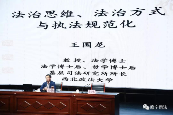 王国龙教授的“法治思维、法治方式与执法规范”为主题的报告,结合典型案例,分别从法治思维和法治方式的内涵、规范执法的基本原则和要求,基层执法规范化的现状、问题及应对出路,加快法治政府建设,带动社会治理创新四个方面进行了深刻阐释。报告指出,要聚焦乡村振兴战略围绕“产业兴旺、生态宜居、乡风文明、治理有效、生活富裕”的总体目标,通过分层分级履责、部门化协同、资源合理化配置、强化责任保障决策和治理行为合法高效,防止涉法涉诉案件发生,不断完善以党建为引领、德治为领导、自治为基础、法治为保障的“四位一体”社会治理体系。
