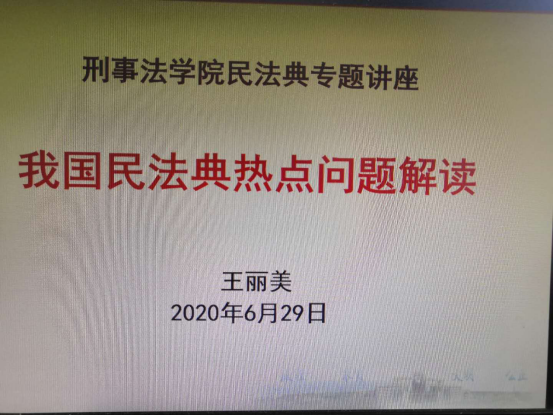 王丽美副教授从我国民法典的地位、价值与进步、民法典总则编的热点解读、民法典物权编的热点解读、民法典合同编的热点解读、民法典人格权编的热点解读、民法典婚姻家庭编的热点解读、民法典继承编的热点解读、民法典侵权责任编的热点解读八个方面对民法典问题进行了解读。并对民法典中新增居住权制度、完善强制缔约义务、完善电子合同规则、债务加入的规定、增设保理合同、增加物业服务合同、民法典人格权编中生命权、身体权、健康权和隐私权与个人信息保护、民法典中夫妻共同债务及离婚冷静期和民法典中的继承权方面进行了详细讲解。王丽美副教授在讲解民法典热点问题的同时通过现实中案例,使师生更容易的掌握了民法典的核心知识点,赢得了师生的多次掌声。并在最后的交流环节,王丽美副教授和学院赵姗姗老师就老年人的养老问题及健康权问题进行了进一步的探讨。