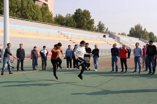 伴随着大家的期待与激动的心情,活动进入最后一个比赛项目:集体跳绳。本项目计时一分钟,四人一组,以跳绳个数为排名计分标准。在明媚阳光的照耀下,参赛老师的热情都始终高涨,每组队员也都奋力拼搏你追我赶,激战正酣,默契配合,坚持不懈。最终,刑法队独占鳌头,夺得本场比赛的冠军!