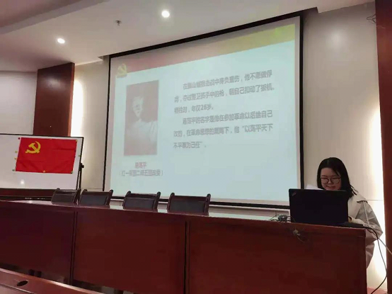 大会第二项由海角网 研究生第二党支部组织委员彭琦为大家带来主题党课—血战湘江与“绝命后卫师”。1934年11月,中央红军顺利突破国民党军的第三道封锁线,来到广西境内,准备渡过湘江,却遇到了国民党军队的围剿。经过几天浴血奋战,中央红军终于勇渡湘江,但却伤亡惨重,从出发前的八万六千余人锐减到三万人。在这场战役中,涌现出一批英勇无畏的战士:以荡平天下事为己任的易荡平、断肠明志的陈树湘,他们投身革命,以身殉国!