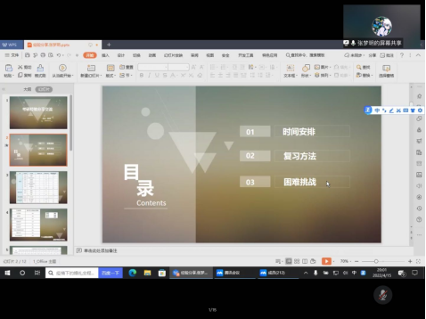 张梦玥学姐主要讲解了考研各个科目的复习方法以及规划。提醒大家要有自己大致的每个阶段的时间安排,细化到每个月、每一周,要及时总结,适当变化。
