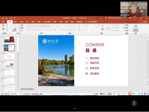 张邱荥学长从四个方面分享了自己的考研经验。首先学长进行了自身情况说明,坦言自己本科成绩并不高,激励同学们努力学习。其次学长为我们提供了信息共享,包含了第四轮法学学科评估结果以及北京大学法学院硕士研究生的基本情况。之后学长介绍了自己的备考历程,并通过自己两次的考研经历总结出些许经验教训惊醒同学们。