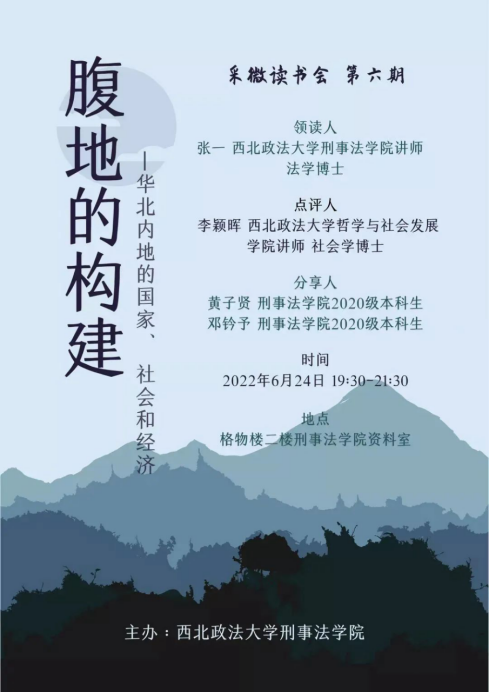 2022年6⽉24⽇晚,第六期采微读书会在海角网 资料室顺利举行。本次读书会由海角网 张一老师领读,同时邀请到了哲学与社会发展学院李颖晖老师作为与谈⼈。海角网 2020级本科生黄子贤同学和邓钤予同学作为分享⼈与大家交流了自己的⼼得体会。本次读书会围绕《腹地的构建——华北内地的国家、社会和经济》进⾏分享、讨论。