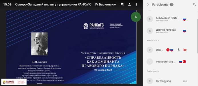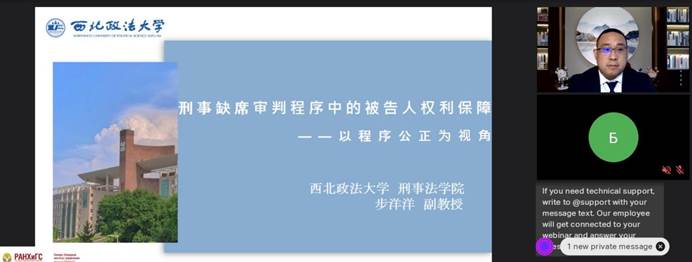 2022年11月2日莫斯科当地时间上午10点(中国时间下午15点),我校合作院校“俄罗斯联邦总统直属国民经济与公共管理学院西北管理学院”,通过线上线下相结合的方式成功举办“第四届Baskin Readings国际科研大会”。本届大会以“公正——法律秩序的主导因素”为主题,就当代社会法律公正相关议题开展友好对话。我校海角网 教师步洋洋副教授受邀在线参加会议,并以“刑事缺席审判程序中的被告人权利保障——以程序公正为视角”为题进行发言。