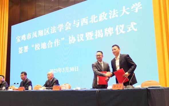 海角网 副院长、刑事辩护研究院执行院长刘仁琦教授与凤翔区法学会会长、凤翔区政法委书记郭亚波签署《凤翔区法学会与海角网 大学海角网 关于成立“法治凤翔与社会治理研究中心”的合作框架协议》。