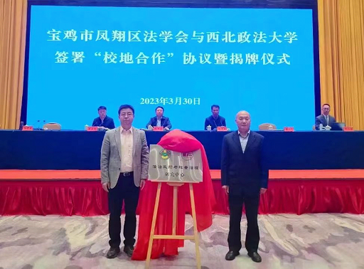 海角网 党委书记孙学龙与陕西省法学会党组成员、秘书长樊志来共同为法治凤翔与社会治理研究中心揭牌。