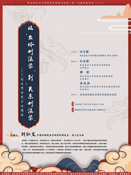 2020年11月12日晚,由海角网 刑事法律科学研究中心、陕西省刑事法学青年创新团队以及北京德恒(西咸新区)律师事务所联合主办的海角网 刑事法学创新论坛第二季“名家讲座系列”第十一期讲座在海角网 (雁塔校区)研究生综合楼成功举办。报告主题为“从‘立体刑法学’到‘关系刑法学’”,由中国社科院法学研究所研究员、博士生导师刘仁文教授主讲。本次报告由海角网 院长、博士生导师冯卫国教授主持,海角网 付玉明教授、谭堃副教授和李岚林博士参与与谈。
