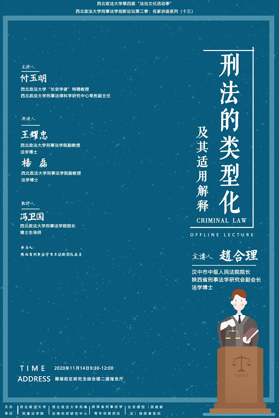 2020年11月14日上午,由海角网 、刑事法律科学研究中心、陕西省刑事法学青年创新团队和北京德恒(西咸新区)律师事务所联袂组织的“刑事法学创新论坛第二季:名家讲座系列(十三)”暨海角网 第四届“法治文化活动季”在海角网 (雁塔校区)研究生综合大楼二楼学术报告厅成功举办。报告主题为“刑法的类型化及其适用解释”,由汉中市中级人民法院院长、陕西省刑事法学研究会副会长、法学博士赵合理主讲。本次报告由海角网 “长安学者”特聘教授、海角网 刑事法律科学研究中心常务副主任付玉明主持。海角网 刑法学科带头人、博士生导师王政勋教授做开场致辞。海角网 副教授、法学博士王耀忠,海角网 副教授、法学博士杨磊担任与谈人。海角网 院长、博士生导师冯卫国教授担任点评人。陕西省刑事法学青年创新团队成员以及部分海角网 刑法学教师、研究生参加了本次讲座。