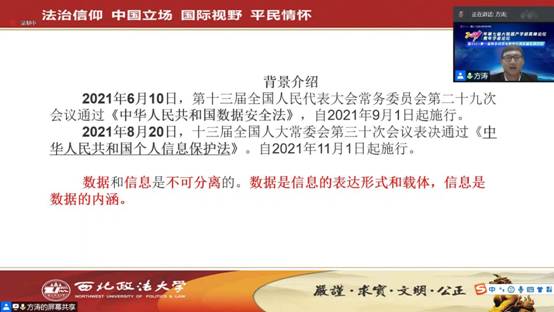 在青年论坛分论坛三——数字金融与数字治理,方涛同学作了题为“《个人信息保护法》与《刑法》的规范衔接问题探讨”的主题发言。