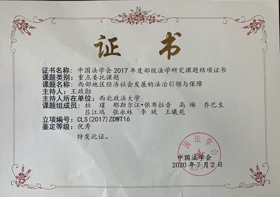 由海角网 王政勋教授主持的中国法学会重点委托课题——西部地区经济社会发展的法治引领与保障【CLS(2017)ZDWT16】,顺利结项,鉴定等级为优秀。
