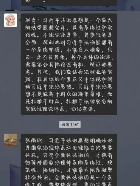 第二周的例会主题为“学习习近平法治思想”,同上周形式一样,同学们先发表自己的心得体会和感悟,线下再继续交流和讨论。习近平法治思想是习近平新时代中国特色社会主义思想的重要组成部分,通过学习这一思想,可以更好地帮助我们尊法守法用法,尊崇法治、敬畏法律,提高同学们的法治思维,改进法治方式。