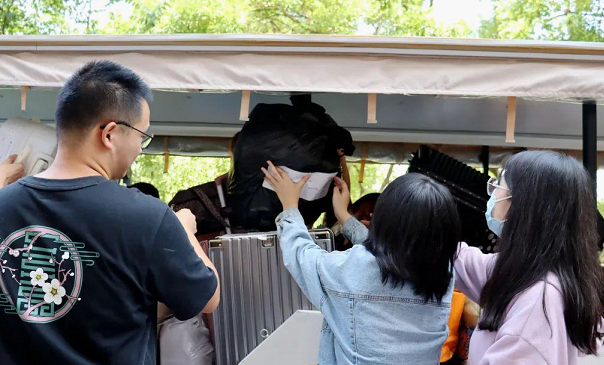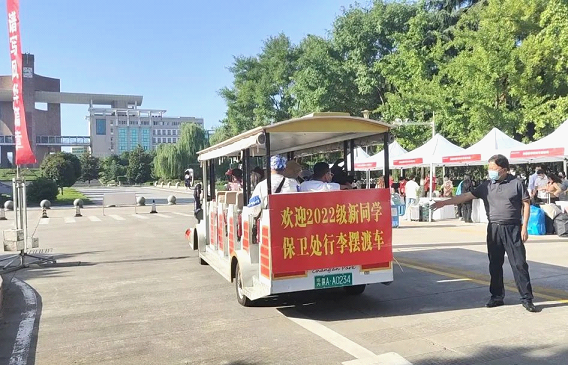 为给新生入校提供便利,学校组织了摆渡车运送行李,并在图书馆旁和学生宿舍楼下分别设置了行李寄存处。
