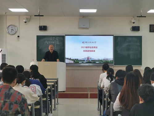 大会伊始,杨军老师通过匿名问卷调查,对在场毕业生们对于就业的态度与真实想法进行了解,随后以此为切入点,深入分析数据背后同学们对于就业的认识。接着,杨军老师从全国毕业生总体就业形势、全校毕业生的就业形势以及学院毕业生的就业形势三个方面进行系统解读并以我校近三年的考研、考公、就业数据为参考,帮助大家认清当前的就业形势,转变大家对当前就业形势的错误认知。他鼓励同学们要充分利用学校提供的各种招聘信息和就业平台,积极主动求职。同时,杨军老师就同学们在问卷中提出的问题进行了耐心解答,并鼓励大家紧抓机会、主动出击、坚定信心、迎难而上,最终成功就业,为自己赢得一个光明的未来!