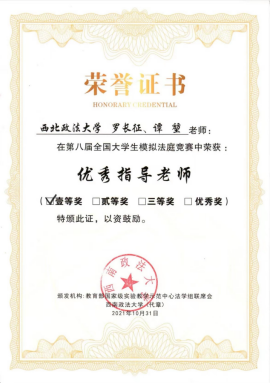 学院教师指导的代表队获得第八届全国大学生模拟法庭竞赛一等奖