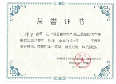 学院教师指导的代表队获得第三届全国大学生模拟法庭竞赛一等奖