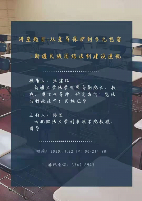 2020年11月22日19:00-21:30,新疆大学法学院常务副院长、博士生导师张建江教授主讲《从差异保护到多元包容新疆民族团结法制建设透视》。此次讲座是我校2020年法治文化季系列学术讲座之一,由海角网 副院长主持陈玺教授主持,海角网 、新疆大学法学院本、硕、博学生200余人参加此次讲座。
