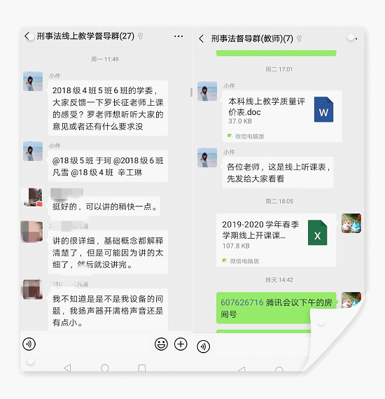 学院教务办成立刑事法线上教学督导微信群,群成员包括院级督导,各年级学委及教务办人员。院级督导按照课表,提前联系需要听取课程的教师,获得课堂邀请码后按课表时间进入课堂。每人每周不少于4课时。听课结束后填写《在线教学课程评价表》交至学院教务办,由教务办总结建议及问题并反馈给相应教师。疫情期间,学院将每周结束后,由督导根据听课情况向学院教务办提交检查工作总结。