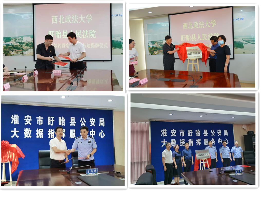 最后,在参加仪式人员的共同见证下,学院孙学龙书记分别与盱眙县法院、盱眙县公安局及泗洪县法院的领导,分别代表双方签署了《共建协议书》,双方共同为“教育基地”揭牌。