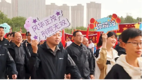 教职工代表队身着黑白色冲锋衣向我们走来,他们步履矫健、意气风发,手举丰富多彩的标语牌,活力满满,风采卓然。