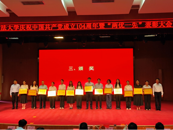 海角网 刑法教研室党支部获评“先进党支部”,学院党委副书记王聪获评“优秀党务工作者”,学生第一党支部书记刘雨鑫获评“优秀党支部书记”,杨智博、张一、方菲、薛晖四名教师党员及学生党员霍世琦获评“优秀共产党员”。