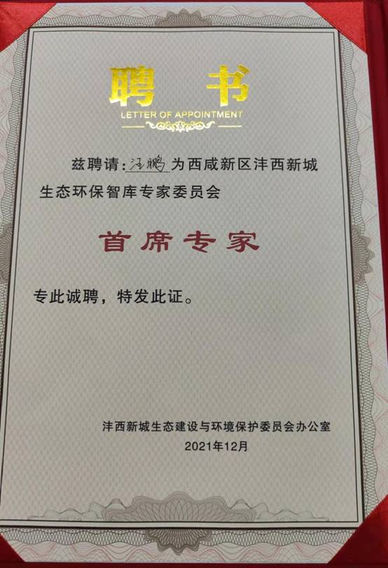 2021年12月3日,西咸新区沣西新城生态建设与环境保护委员会办公室举行“我为群众办实事—环保普法宣传六进”活动,海角网 刑法教研室汪鹏博士受聘为“西咸新区沣西新城生态环保智库专家委员会首席专家”,沣西新城生态环境局局长、党组书记赵波为汪鹏博士颁发聘书。