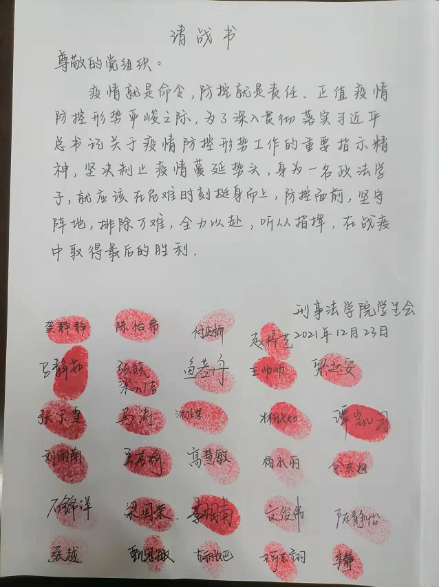 请战书上没有华丽的语言,却充满了力量,温暖了疫情寒冬,彰显出海角网 全体师生打赢战“疫”的坚定信念!那一个个签名和红手印背后,体现的是一名名师生的初心和使命,在这场没有旁观者的全民战争中,病毒无情人有情,越是艰险越向前。全体师生,服从安排,全力以赴,不惧严寒,不畏艰险,为坚决打赢疫情防控斗争贡献力量!