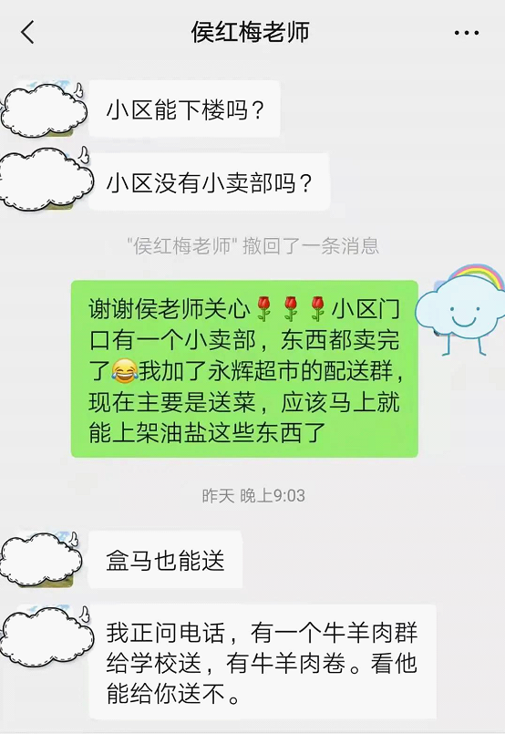 采访中,吴亚可老师说道:“侯老师平时非常热情,也非常关心年轻教师的生活和成长,乐于帮助年轻教师。由于我平时都是在学校食堂吃饭,没开过火做饭,这次疫情封控比较突然,使得家里物资储备不足,小区里食材供应紧张。侯老师了解情况之后,主动为我找了给学校食堂供应食材的老板电话,使我有渠道能够购买一些物资。侯老师平时的热情让我感到亲切,特殊时期的关心让我暖心,为侯老师家长式的操心点赞。”因为天气寒冷加之工作繁忙,杨亚楠老师病倒在工作岗位上。侯老师听说后,亲自为杨老师熬粥、送餐,时刻关心他的身体健康。