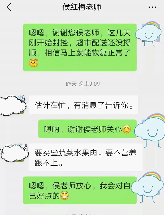 侯老师不仅关心一起工作同事,也非常爱护学生们,关心学生们的身体健康。在这个特殊的时期,因为疫情管控,许多药店不再提供外卖服务。18级考研学生唐宇果因为学业压力导致慢性疾病发作,因为自己无法购药,求助侯老师。侯老师得知后在网上为唐同学找到一家能够配送的药店,并且承诺为唐同学在校门口取药送至她的宿舍。唐同学在采访中感慨:“慢性病不吃药会很不舒服,本来以为学校不会管,让我忍一忍。但是老师们都很体谅学生,咱们刑事法的老师真的很热心。”
