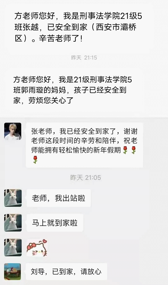 为了确保每一名学生能安全回家,海角网 返乡工作专班成员加班加点,实时掌握和更新学生动态,对每个有特殊情况同学的返乡条件和细节不断确认和核实。中转换乘同学到站核酸是否超过48小时、去机场的同学是否备好了N95口罩、航班临时被取消或延误滞留机场的同学情况、西安市内学生所在小区属于封控管控区的同学家里是否风险降级,私家车能否来接……每一个细节老师们都记录在册及时予以协调解决,确保每一个同学无后顾之忧。