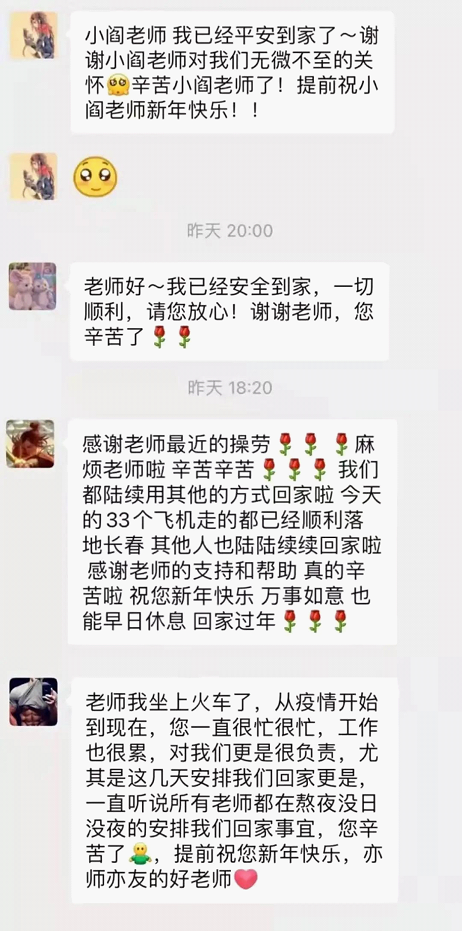 非常感谢学院的老师们和志愿者们为我们返家保驾护航,作为学生我感到特别温馨和激动。值此严峻时刻我们能够安全有序回家,离不开学院的细致安排和老师们志愿者们的辛苦付出。愿长安常安,共克时艰!