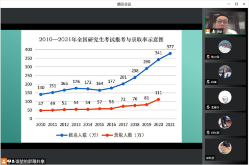 谭堃老师在会议中对近年考研人数与录取统计的数据进行分析,针对性说明了当前考研形势严峻以及2023年考研需要注意的问题。