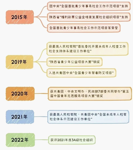 目前已成为陕西省社会工作协会理事单位、西北大学哲学学院大学生劳动教育实践基地、西北大学社会工作专业硕士(MSW)教育中心实践基地。至今,中心已经为3500名以上的涉罪未成年人提供了合适成年人在场维权服务、社会调查、观护帮教等服务,开展了近60次法治进校园宣讲活动,动用1000余人次 ,志愿者演出情景剧200余幕,发放各类维权、预防犯罪、保护成长等普法手册13000余册,还有社区宣讲、法律宣传、其他志愿服务等。
